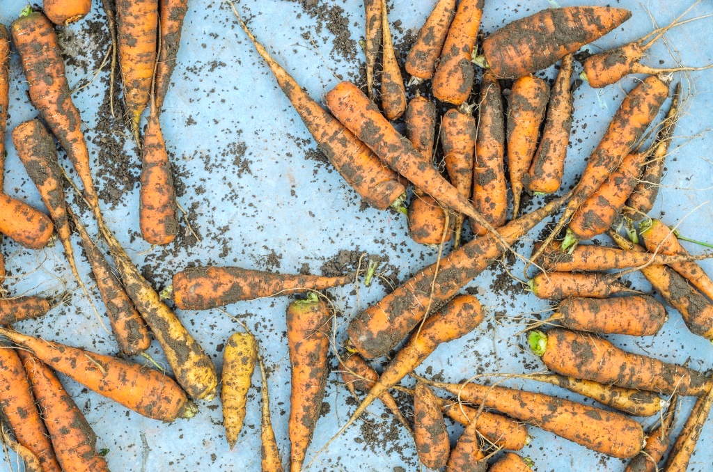 Dirty organic orange carrots closeup