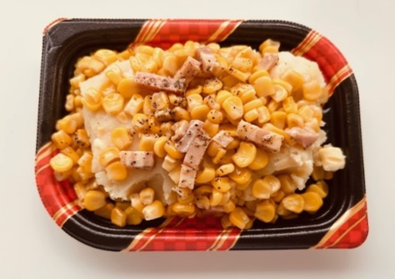 コーンポテトサラダ  ~今から売れるクリスマスメニュー開発準備~ 不思議なことに毎年Xmasには ポテトサラダ商品が ビックリするほど売れます 今から売り込んでおいしさをPR 自店の自慢メニューで クリスマスに単品大量販売を するための事前販促強化策です ローストチキンにポテトサラダ 洋風メニューにピッタリ合いますね 今年は「フランス風」にレベルを上げて 今から売り込みです ベースのポテトサラダは できれば手づくりが良いのですが 仕入れたおいしいポテトでもOK このポテトサラダに ベーコンとコーンを たっぷりと合わせます コーンは甘い冷凍コーン カットしたベーコンは 塩コショウ少々と 油とバターで炒めます ボリュームを付けて トレーに盛り付けます 写真にはありませんが クリスマスには飾りを添えて …